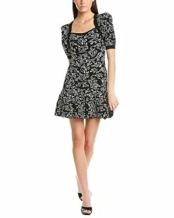 - Afternoon Shadows Mini Dress in black multicolor with square neckline, puff sleeves, ribbed trim and flounce hem