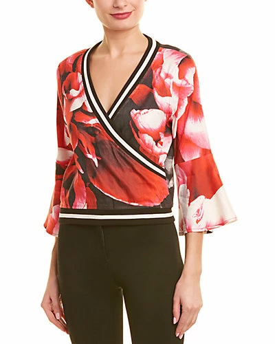 - Design details: crossover front, ribbed trim, bell-sleeves