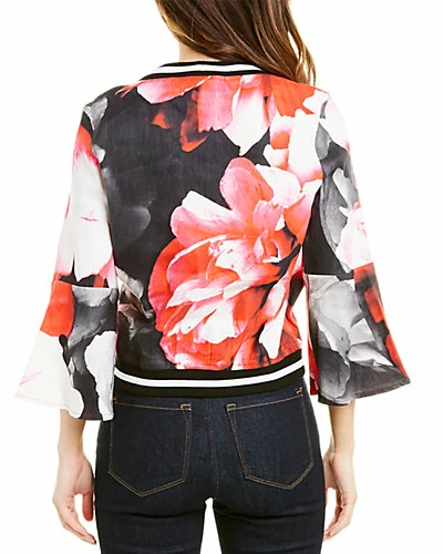 - Design details: surplice neck, contrast ribbed trim, bell sleeves