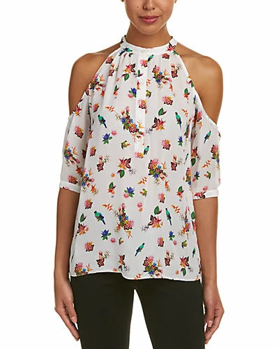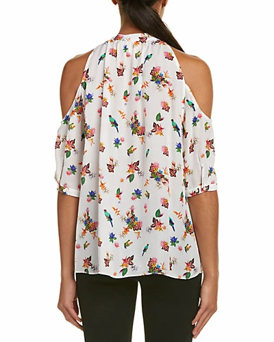 - Design details: printed chiffon design, cold-shoulder style, shirred neckline, mandarin collar, button cuffs