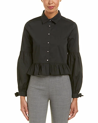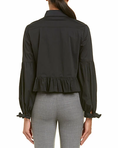 - Design details: spread collar, ruffled peplum waist, shirred bishop sleeves with self-tie cuffs