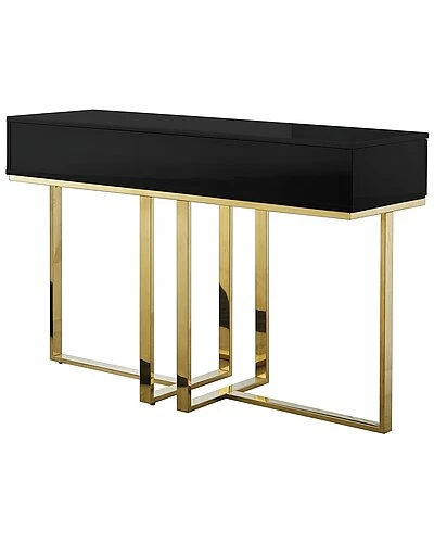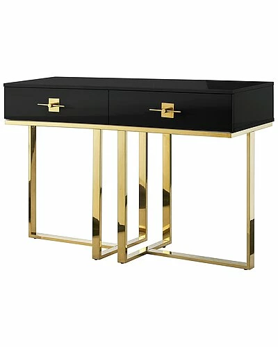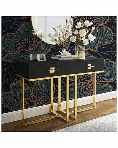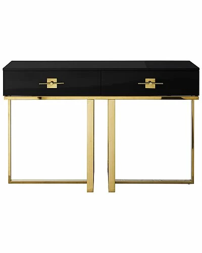 - Sleek and stylish combination of materials gives this console table a fresh contemporary look. The tables top has a high gloss lacquer finish while stainless steel base and drawer pull handles have a polished look. If you love the shiny modern style, this clean and glamorous console table will immediately capture your attention, providing the look you want. Featuring two drawers for storage and beautiful shiny hardware, this exquisite piece will make an unforgettable impression on all your guests adding depth to your living room, entryway or dining room.