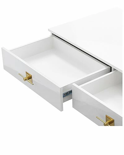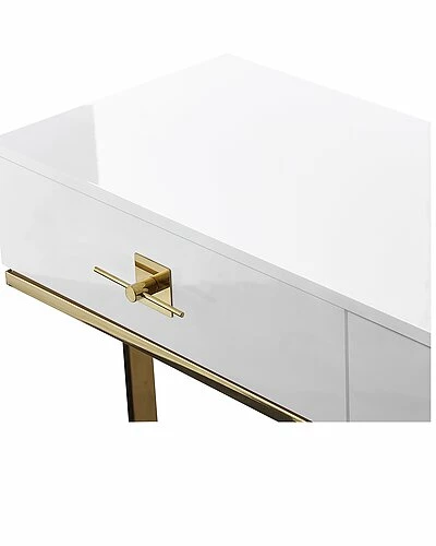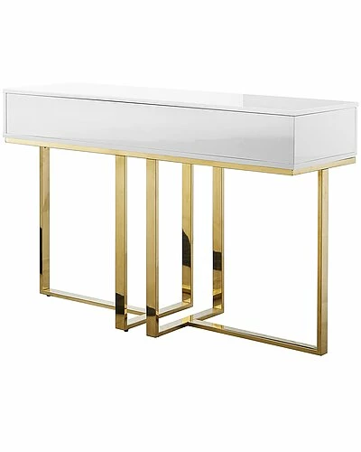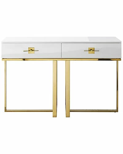 - Sleek and stylish combination of materials gives this console table a fresh contemporary look. The tables top has a high gloss lacquer finish while stainless steel base and drawer pull handles have a polished look. If you love the shiny modern style, this clean and glamorous console table will immediately capture your attention, providing the look you want. Featuring two drawers for storage and beautiful shiny hardware, this exquisite piece will make an unforgettable impression on all your guests adding depth to your living room, entryway or dining room.