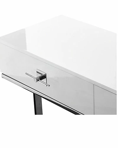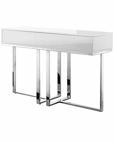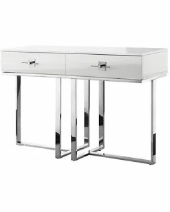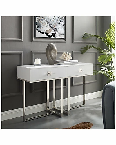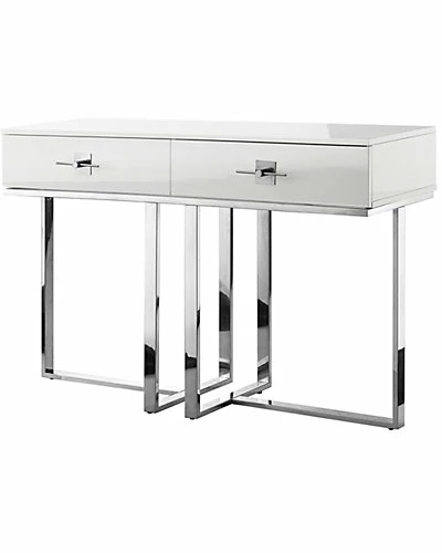 - Sleek and stylish combination of materials gives this console table a fresh contemporary look. The tables top has a high gloss lacquer finish while stainless steel base and drawer pull handles have a polished look. If you love the shiny modern style, this clean and glamorous console table will immediately capture your attention, providing the look you want. Featuring two drawers for storage and beautiful shiny hardware, this exquisite piece will make an unforgettable impression on all your guests adding depth to your living room, entryway or dining room.