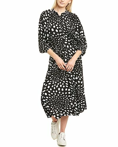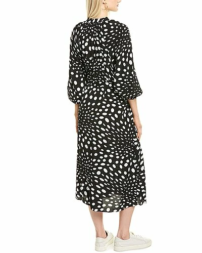 - Design details: shirred mock collar, 3/4-length blouson sleeves, and self-tie sash at waist