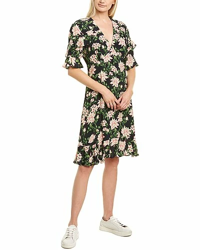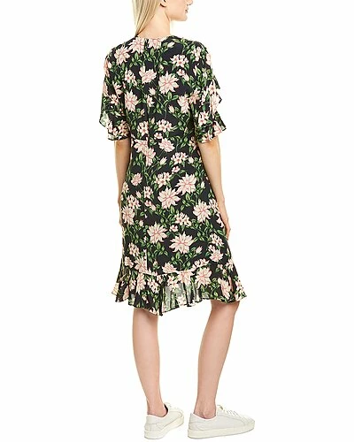 - Design details: V-neck, elbow-length sleeves, and ruffled trim