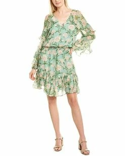 - Design details: V-neck with keyhole, blouson sleeves, smocked waist, and ruffled trim