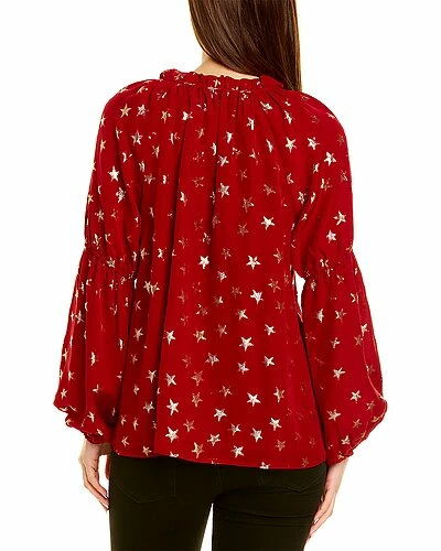 - Star Lurex Peasant Blouse in wine with lurex print, keyhole neck with self-tie closure, ruffle trim and gathered detailing at sleeves